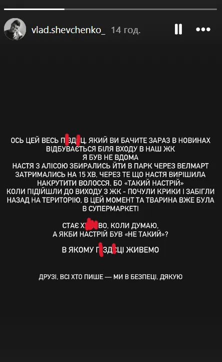 Сім’я блогера та зірки "Ліги сміху" Влада Шевченка ледь не опинилася в епіцентрі теракту в Києві, що стався у Голосіївському районі. Дружина артиста разом із маленькою донькою мали пройти через супермаркет "Велмарт", де згодом відбулося захоплення заручників, однак затрималися вдома приблизно на 15 хвилин.