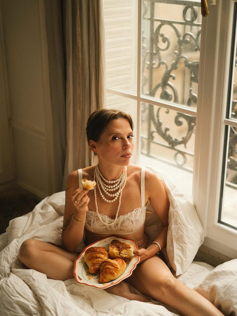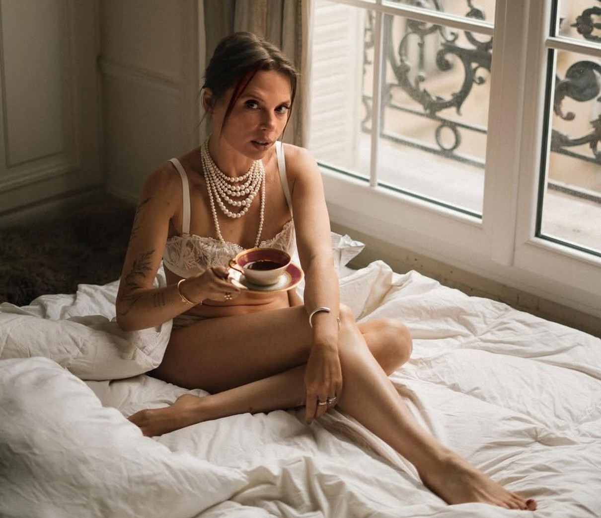 44-річна зірка поділилася власними рецептами у Instagram, додавши й атмосферні фото, для яких позувала на ліжку, вбрана в спіднє та перли, з круасанами і чашечкою кави.