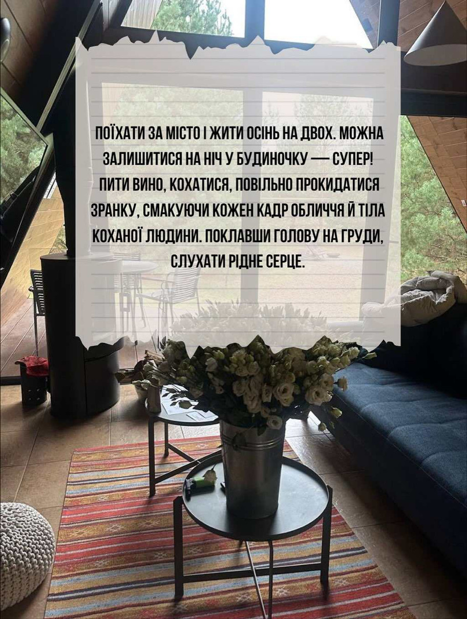 "Їхати кудись осінньою дорогою, дивлячись на вершечки дерев, що стримлять у небо (або йти пішки - безпечніше))))", - пожартувала артистка.