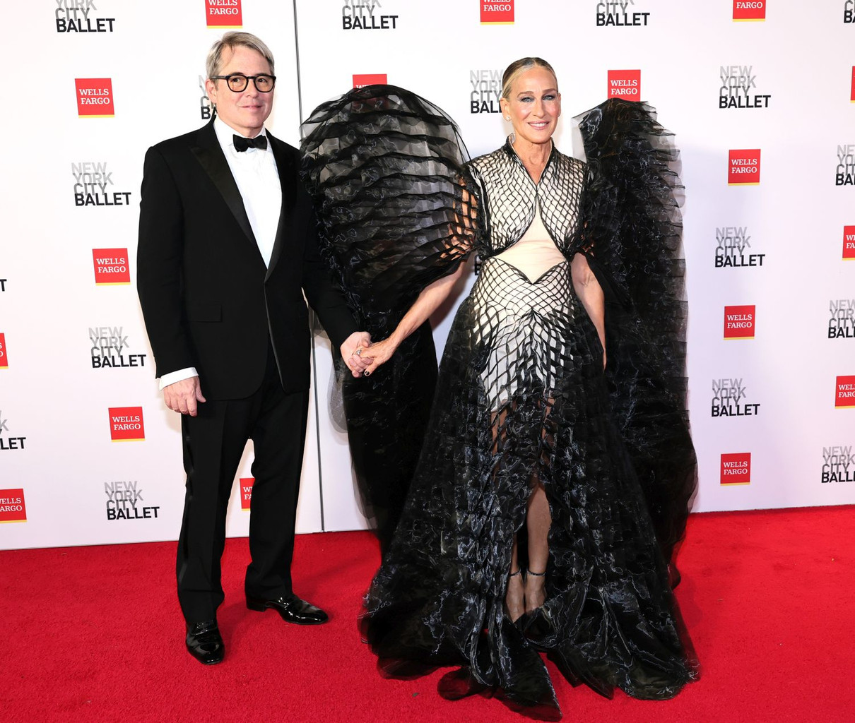 Образ із глибоким вирізом, корсетним верхом і спідницею, що переходить у напівпрозорі текстури, виглядав одночасно елегантно й зухвало. Крила, які стали головним акцентом, додали драматизму — настільки, що актрисі навіть було складно позувати поруч із чоловіком, актором Меттью Бродеріком, не зачепивши його пишними рукавами. Паркeр традиційно продемонструвала почуття стилю, яке давно зробило її іконою моди.