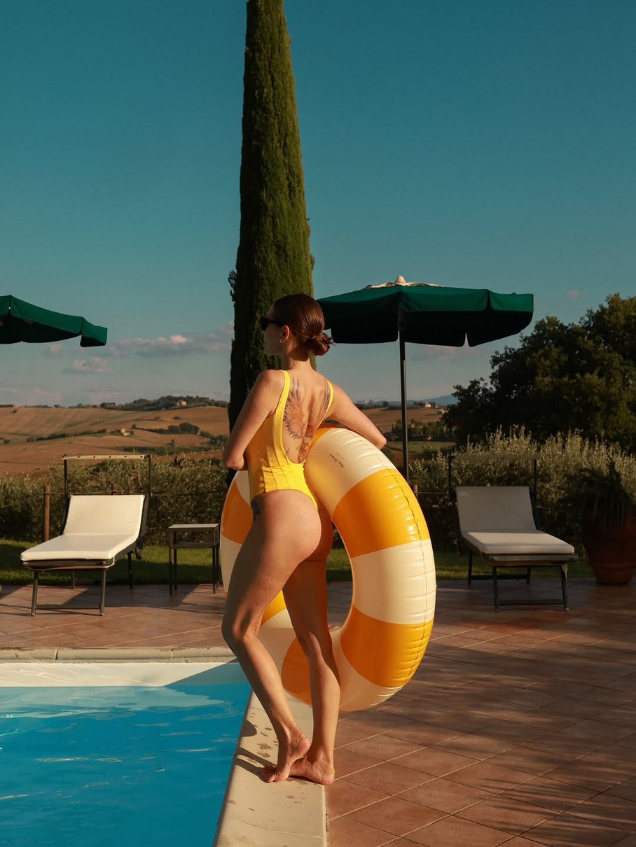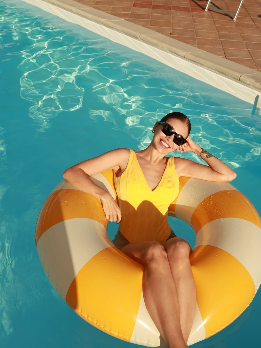 У жовтому суцільному купальнику Олександра наробила соковитих кадрів в басейні з надувним кругом.