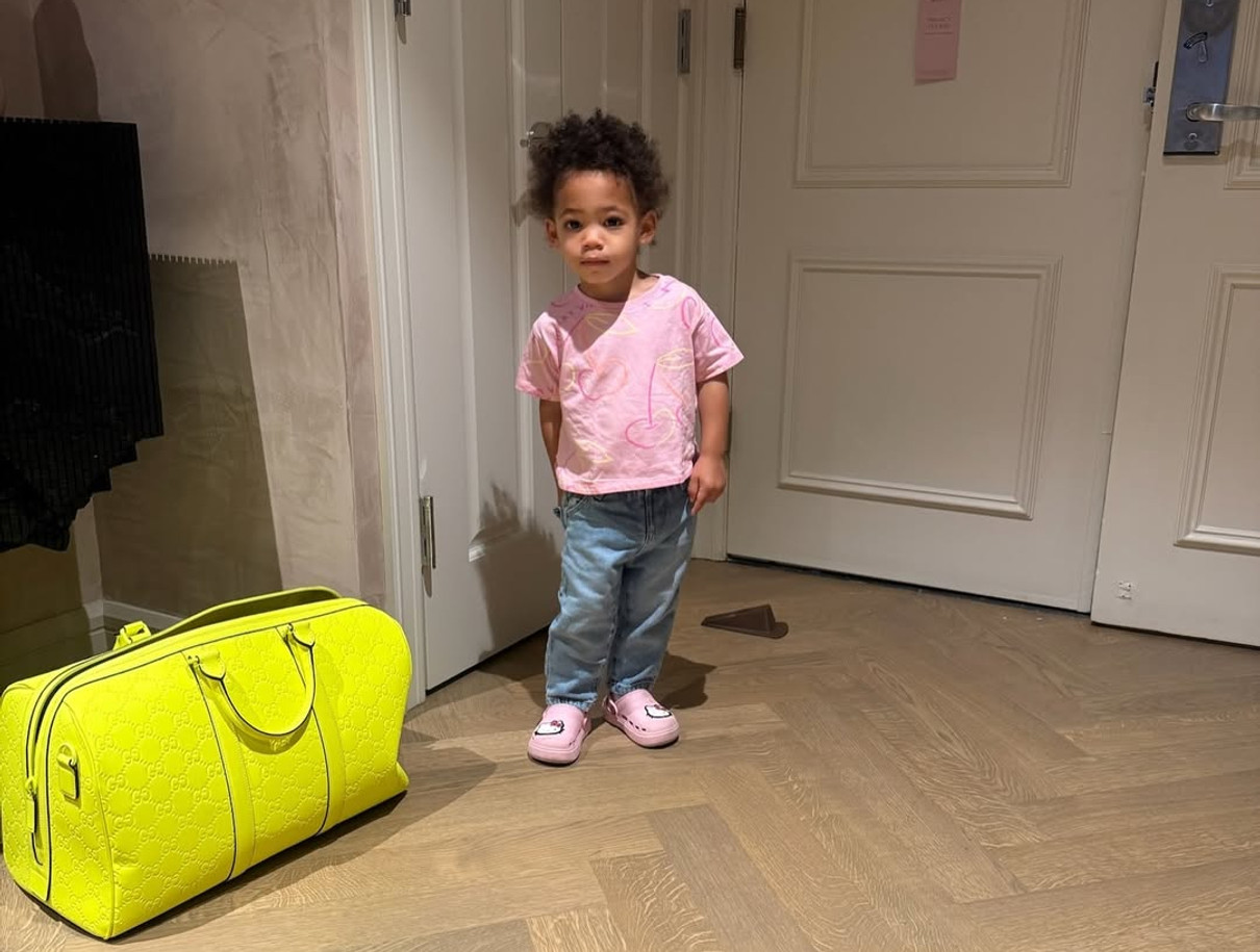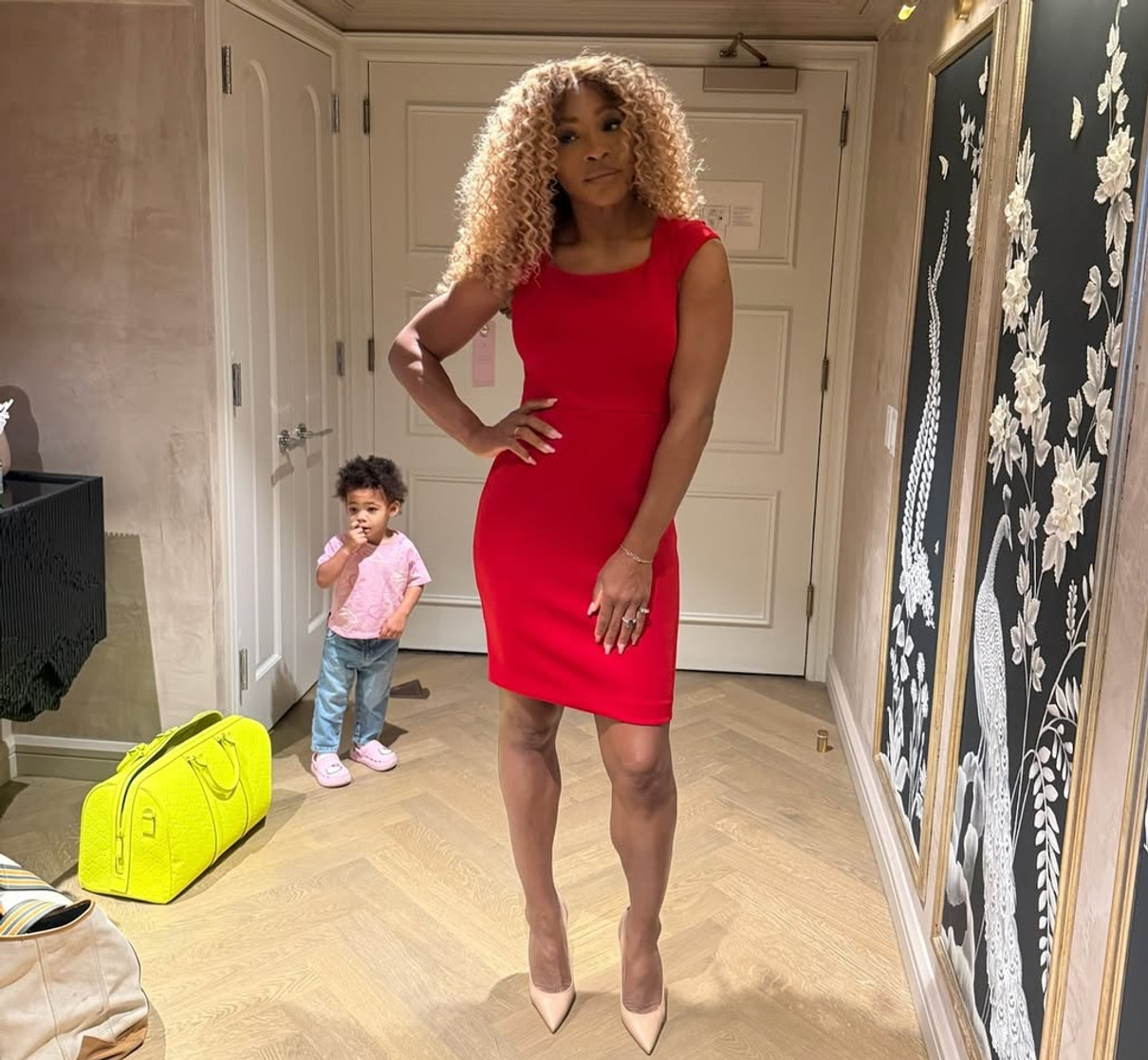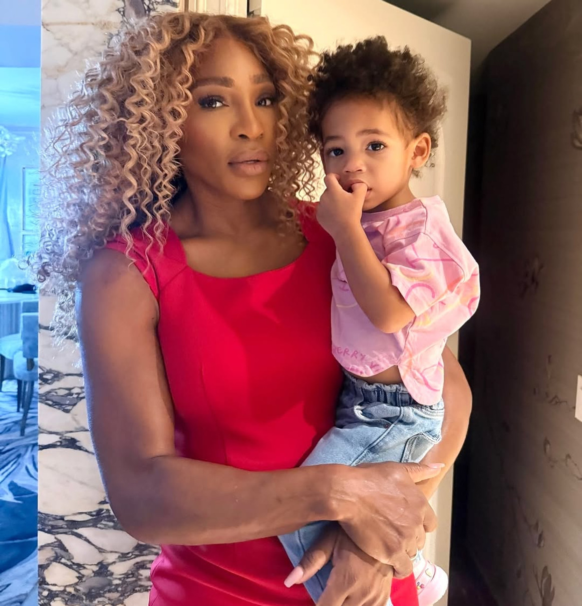 Для знімків у готельному номері спортсменка вдягнула ефектну червону сукню, яка вдало облягала її жіночні вигини, та кремові підбори. Тим часом дівчинка у джинсах і рожевій футболочці притулилася до зіркової матусі.