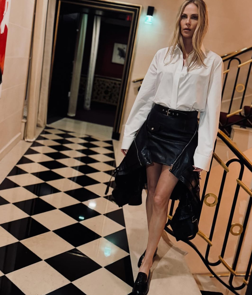 Шарліз попозувала на сходах у білій сорочці, з-під якої виглядав чорний бюстгальтер, та у чорній шкіряній асиметричній спідниці з замочками та люверсами. Свій аутфіт вона доповнила лакованими лоферами.