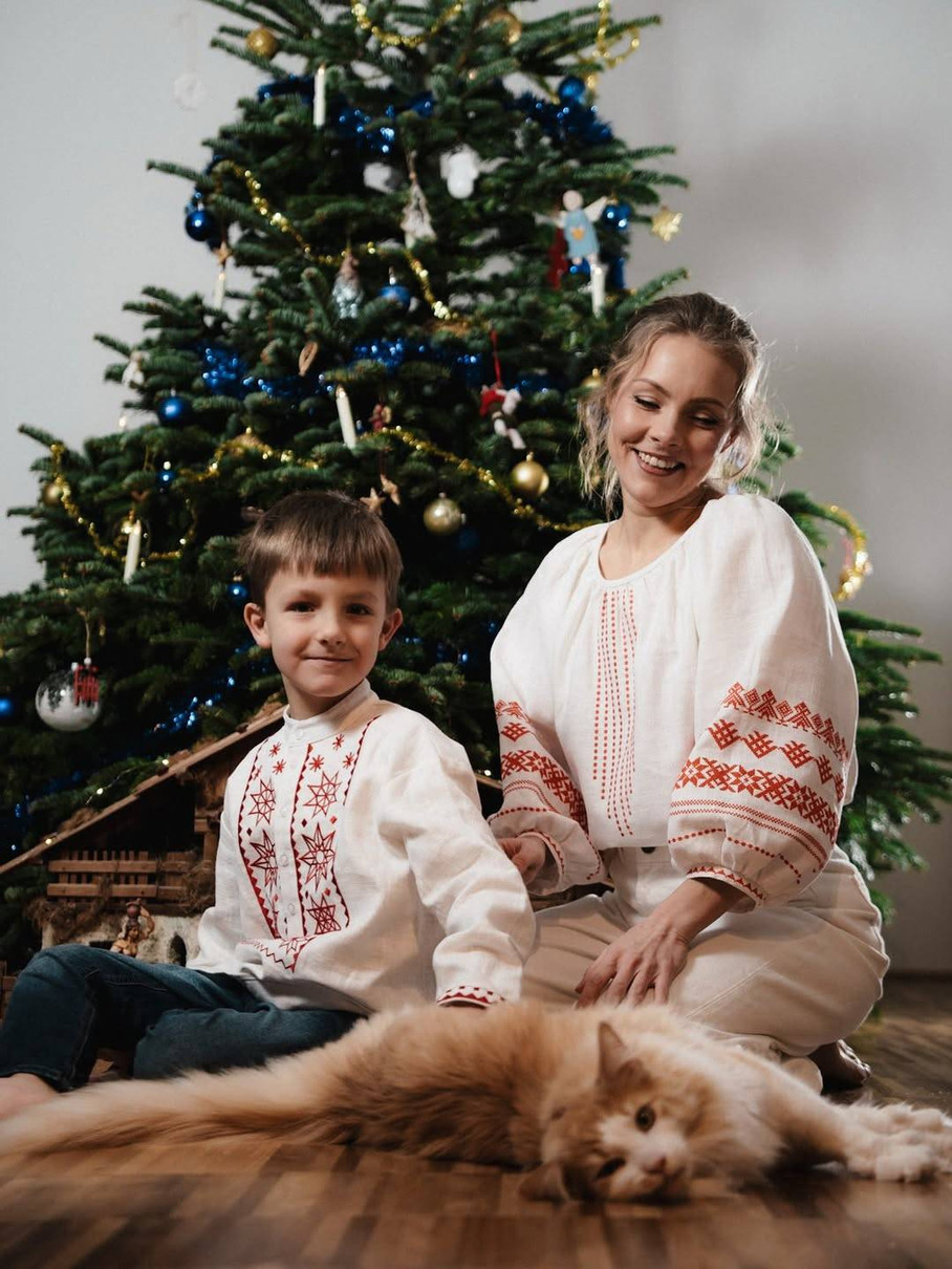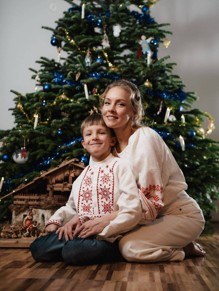 Хореографка Олена Шоптенко та її 7-річний син Олексій, вбрані у вишиванки, попозували коло святкової ялинки для різдвяної фотосесії.
