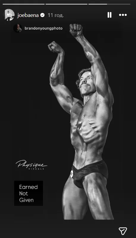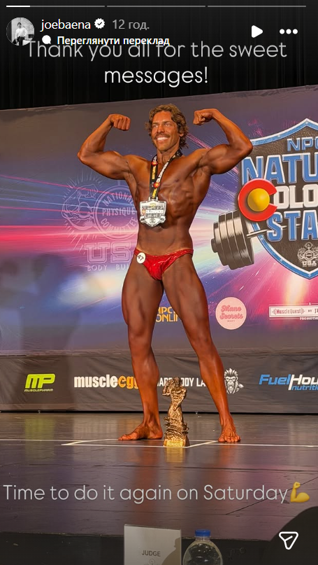 Йдеться про його дебют на подібному рівні, який завершився результатом у категоріях "Чоловічий відкритий турнір з бодібілдингу у важкій вазі", Чоловіча категорія "Класична фігура" (справжні початківці) та чоловіча категорія "Класична фігура" (новачки). Про свій успіх 28-річний Баена повідомив у Instagram, опублікувавши фото зі сцени.