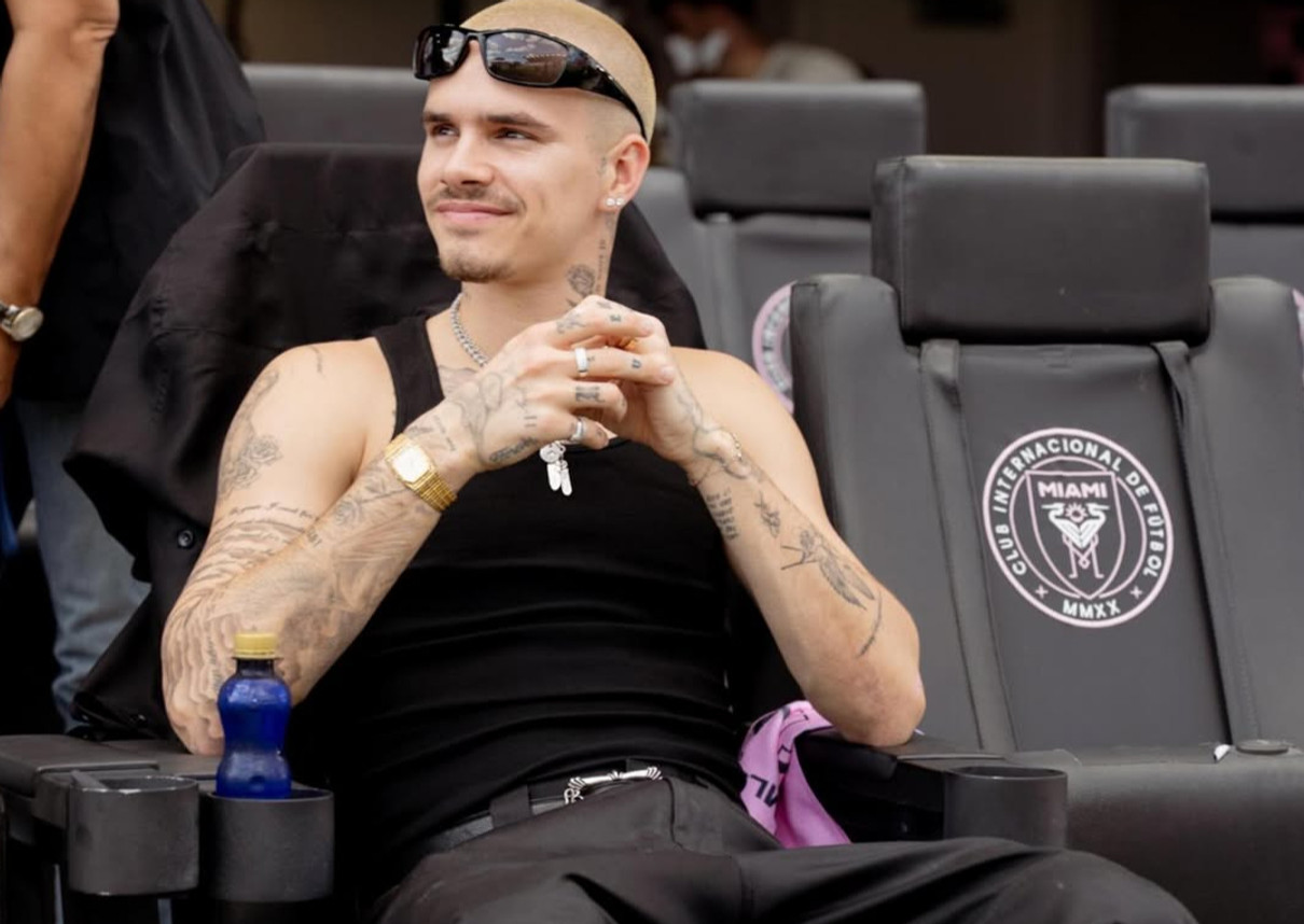Ромео пройшовся подіумом у білій сорочці, чорній краватці та широких джинсах. Образ доповнили шкірянкою оверсайз з хутряним коміром та сонцезахисними окулярами.