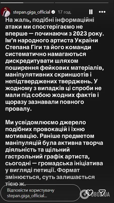 "Ім'я народного артиста України Степана Гіги та його команди систематично намагаються дискредитувати шляхом поширення фейкових матеріалів, маніпулятивних скриншотів і непідтверджених тверджень. У жодному з випадків ці спроби не мали під собою жодних фактів і щоразу зазнавали повного провалу. Ми усвідомлюємо джерело подібних провокацій і їхню мотивацію", – заявили у команді артиста.