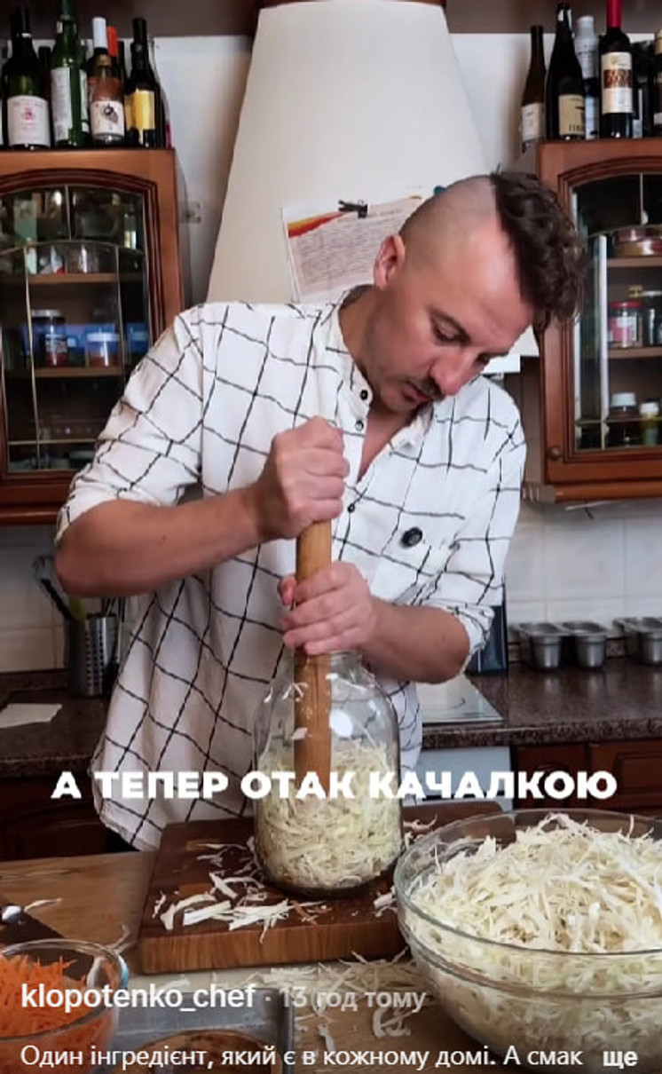 "Що додати у квашену капусту, щоби вона була "вау"? Беремо одну капустину і натираємо її на терці. Те саме робимо з морквою. Коли всю капусту нарізано беремо її і просто гарно запихаємо у банку. Качалкою гарно притискаємо капусту у банці. Це ще така гра - треба 2 кг капусти запхнути у трилітрову банку", - сказав ресторатор.