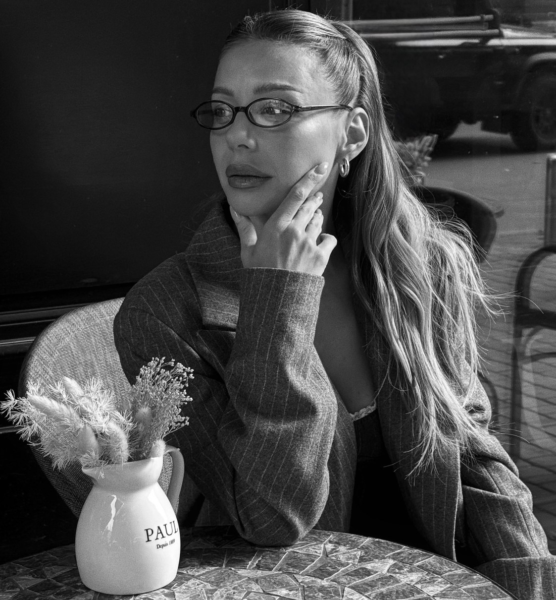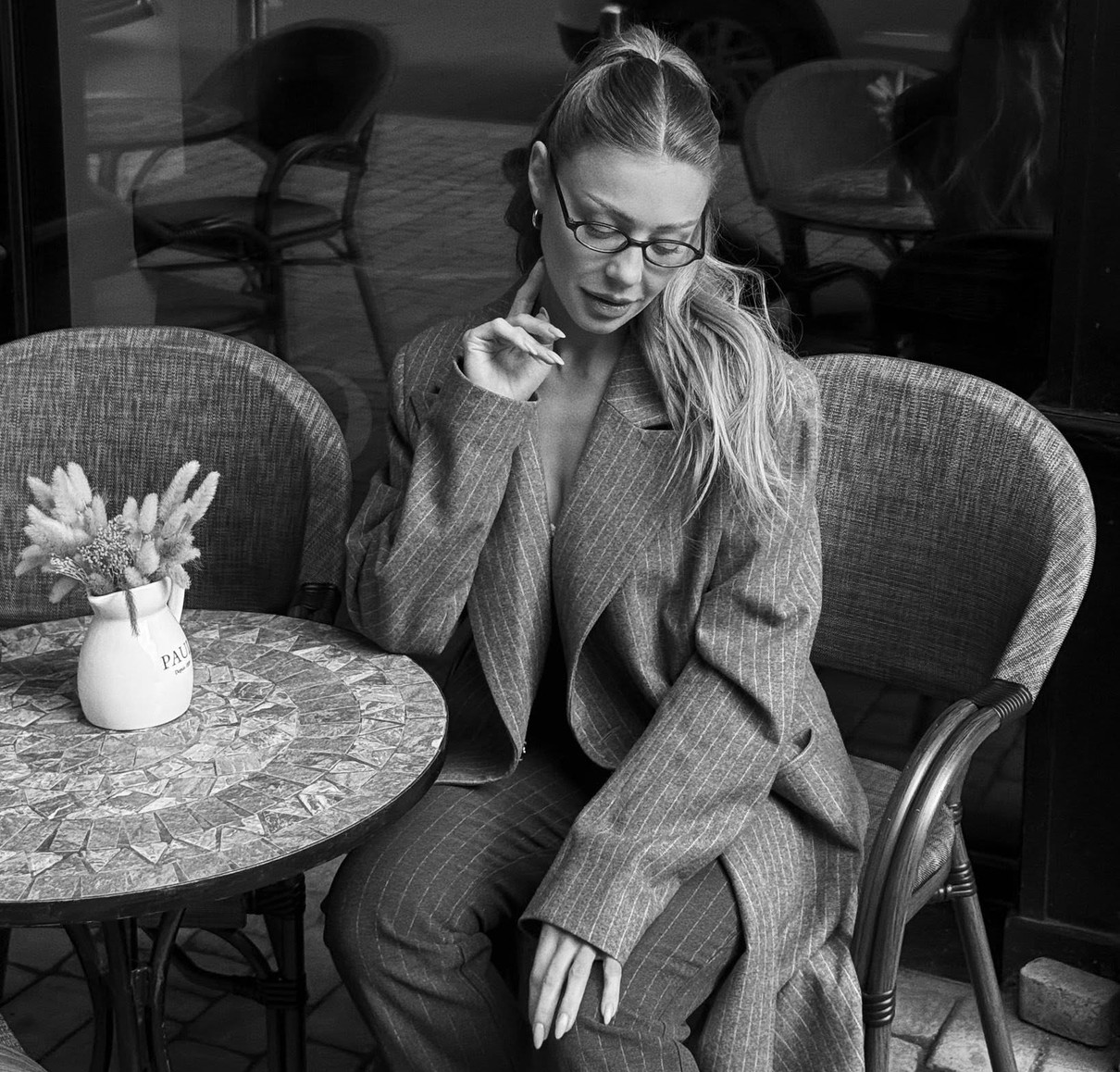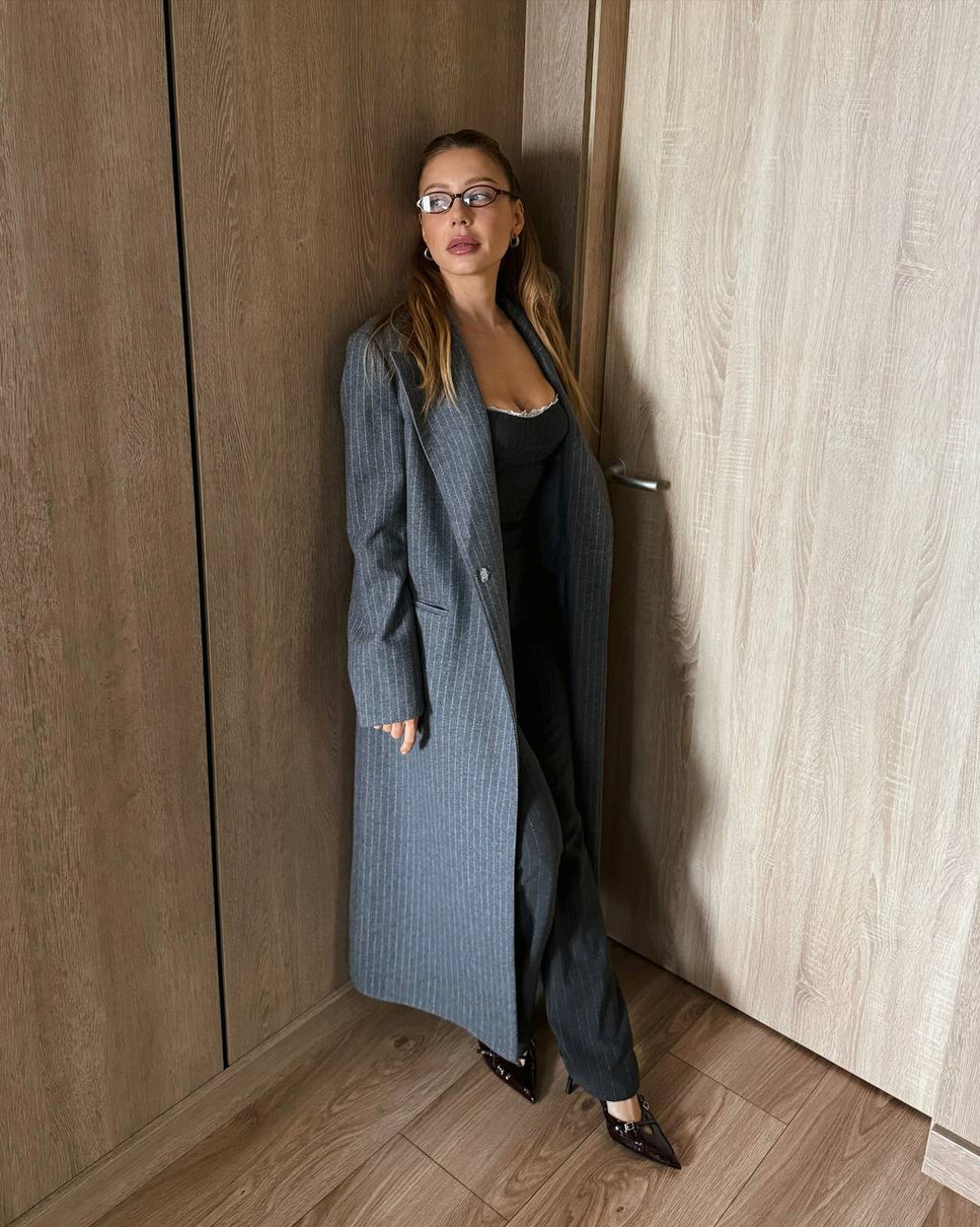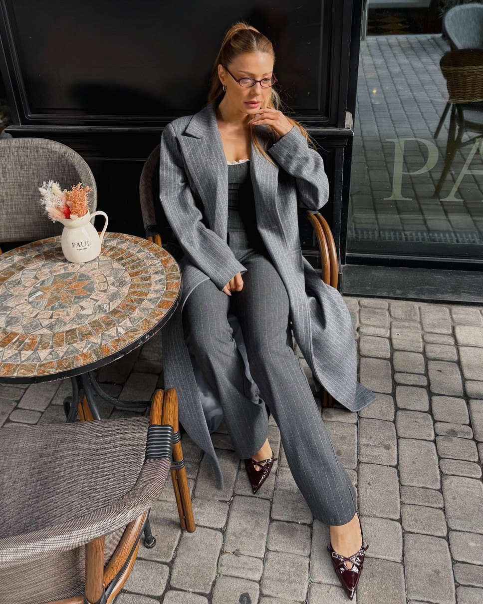 Свій жовтень знаменитість розпочала з відвідування кав'ярні та публікації нових стильних фото, на яких позувала у сірому костюмчику в трендову тонку смужку, що складався з декольтованого топу і штанів кльош.