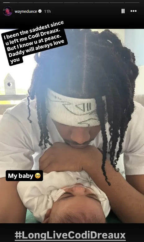 Коханий Корі, фотограф Вейн Дьюс, також поділився зворушливим кадром у власних InstaStories. На фото, де тримає доньку, він написав: "Мені було дуже сумно відтоді, як ти покинула мене, Коді Дрео. Але я знаю, що ти у спокої. Тато завжди любитиме тебе", додавши хештег #LongLiveCodiDreaux.