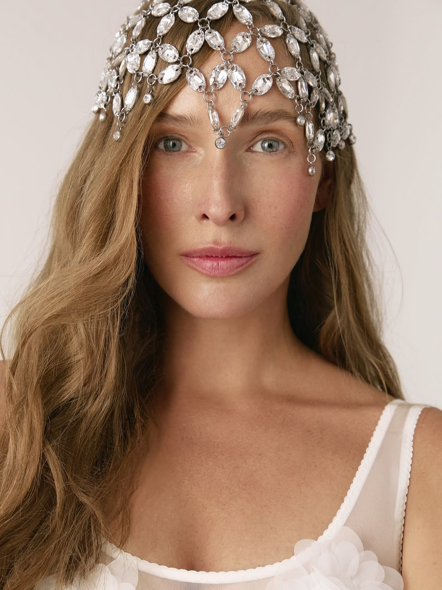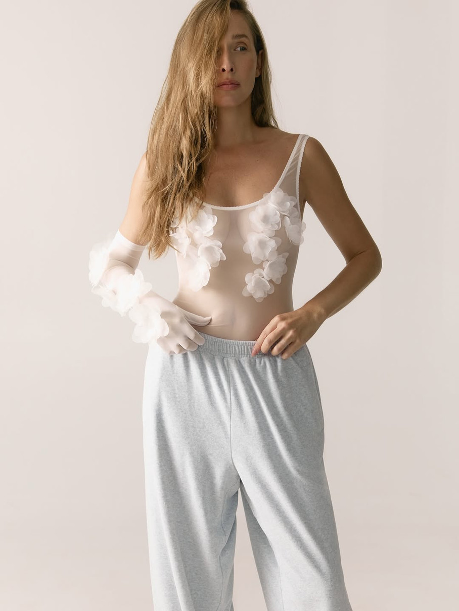 На фото, які Катерина показала в Instagram, зірка позує на білому тлі у шапці з кристалів, а також у прозорій майці з квітами у районі декольте та сірих спортивних штанях.