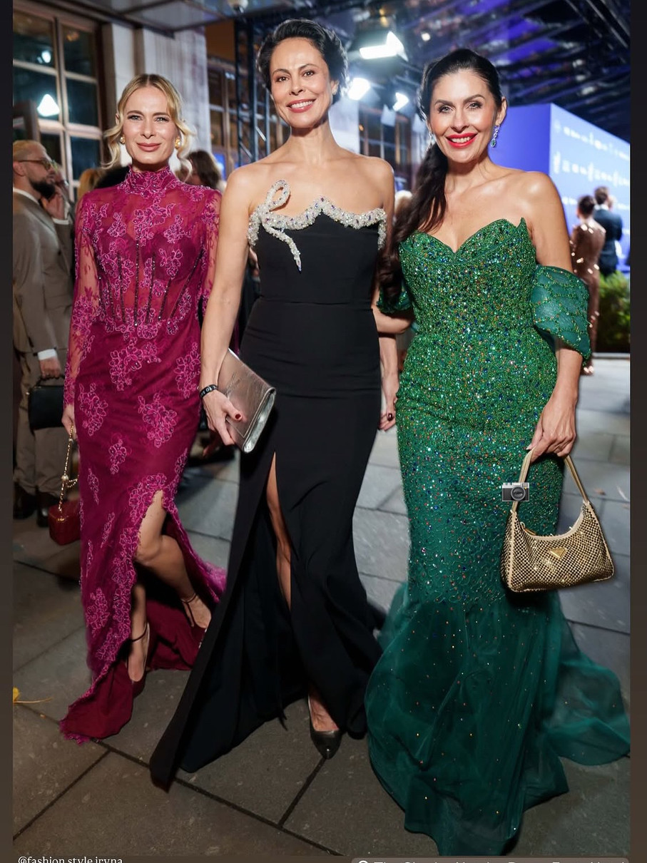 На вечорі Наталія виглядала бездоганно. Вона обрала елегантну чорну сукню від бренду Elbi Sella з відвертим декольте, прикрашеним витонченим сріблястим орнаментом, який створював ефект дорогоцінного мережива. Глибокий розріз додавав образу сміливості, але водночас не виходив за межі класичної вишуканості. Таке плаття в мережі можна знайти за 24 тисячі гривень.