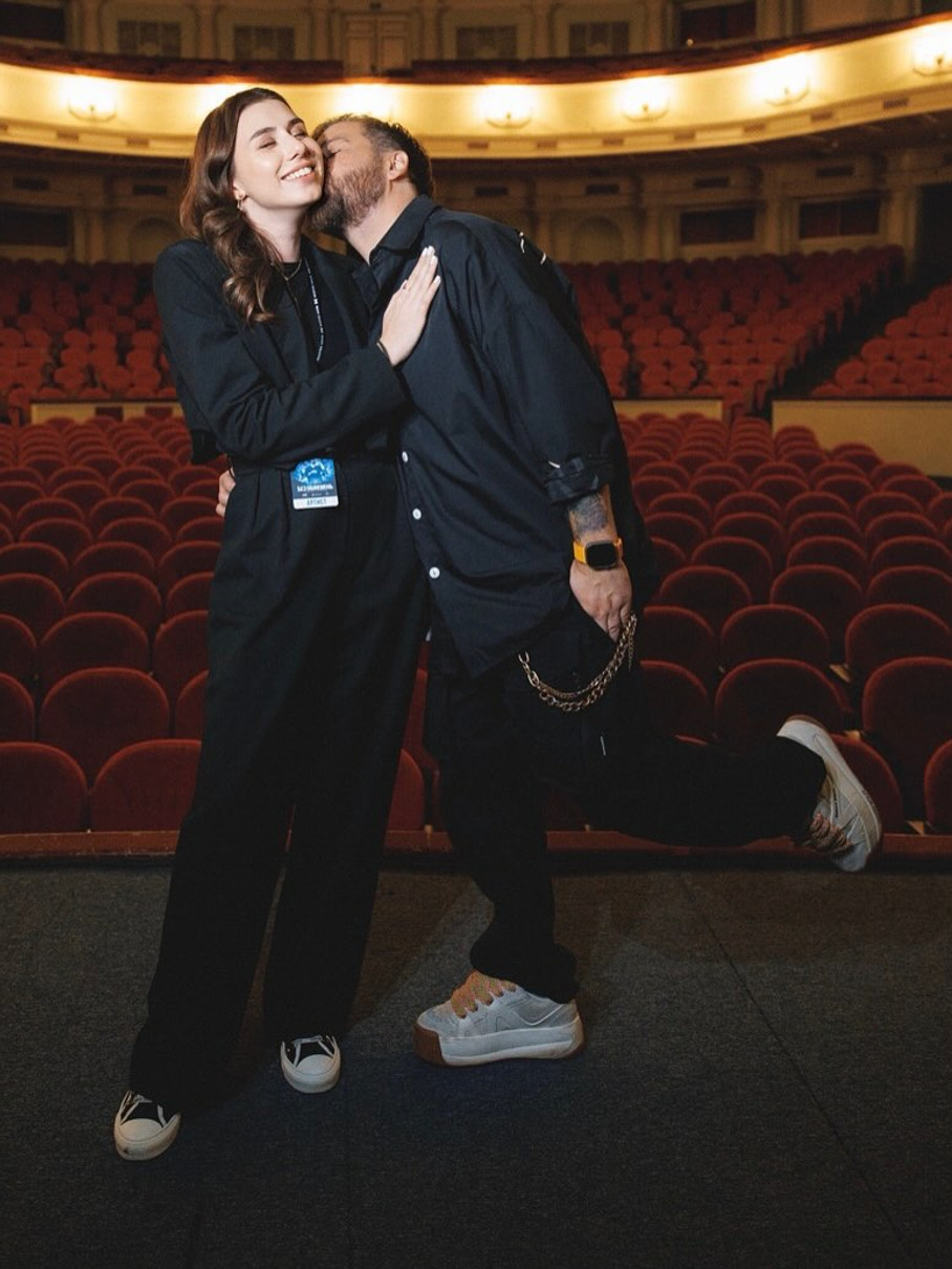 Лідер гурту "Без Обмежень" Сергій Танчинець та його наречена, піарниця Юліана Корецька не забувають про свою улюблену традицію – робити фото з поцілунком на сцені Жовтневого Палацу.