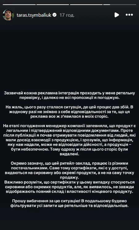 Після появи сумнівів щодо безпечності товарів Цимбалюк видалив рекламні сториз і публічно перепросив аудиторію: "Прошу вибачення за цю ситуацію! У подальшому будемо фільтрувати усі запити ще ретельніше та відповідальніше".