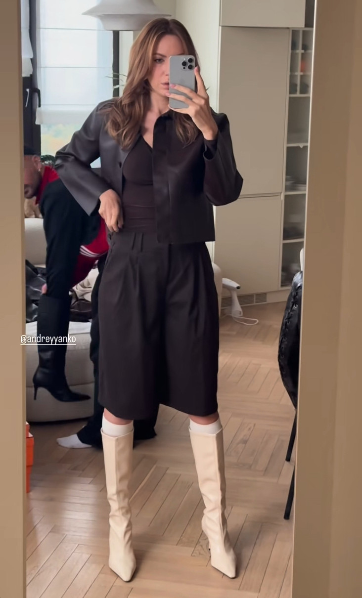 Далі ведуча зазнімкувалась у темно-шоколадному луці, що складався з шортів-бермудів, топу та шкіряного жакета