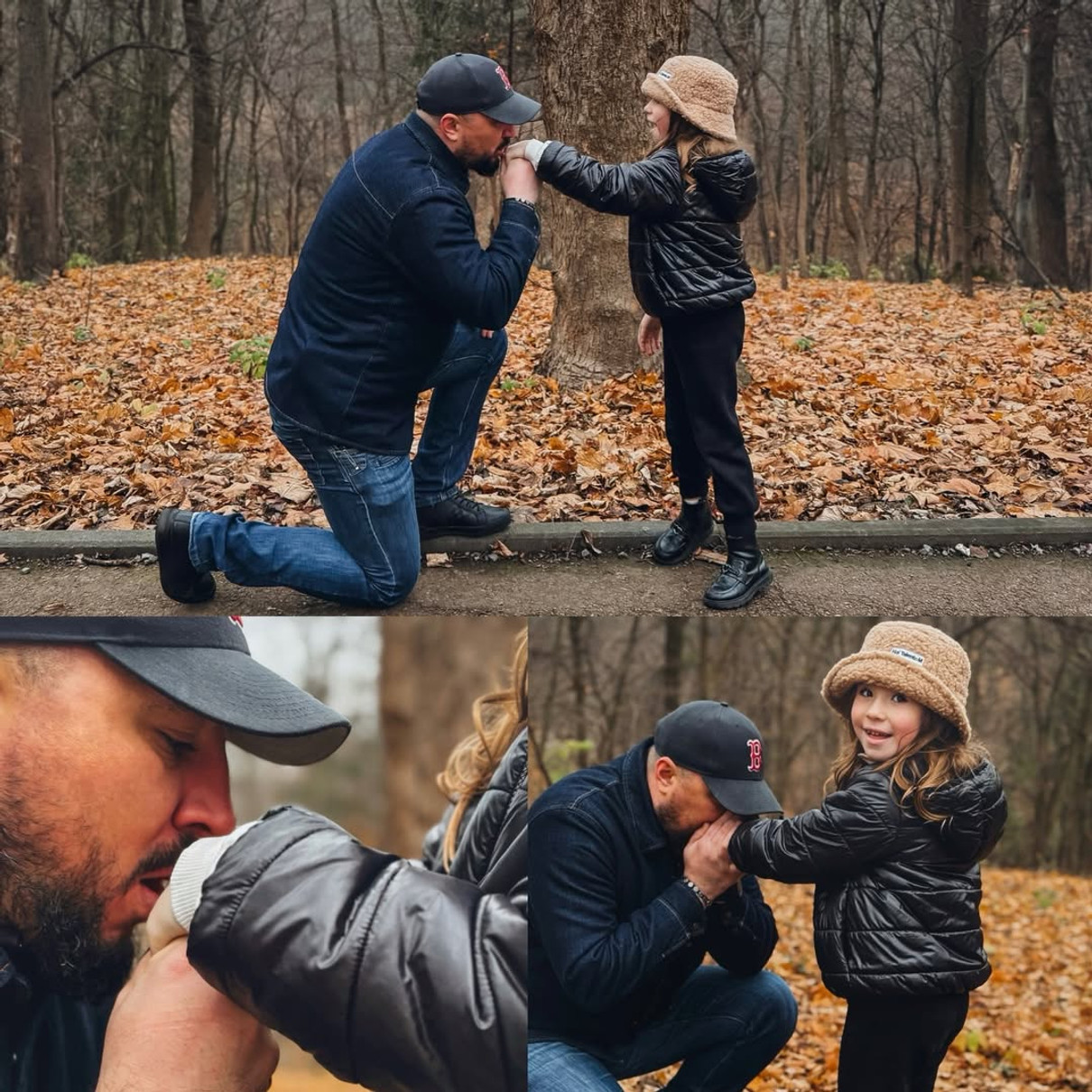Євген розповів, що під час фотосесії донька попросила його стати на коліно "робити пропозицію" і щоби потім поцілував її "по-дорослому". На його питання, де дитина цього навчилася вона відповіла, що в Інтернеті.