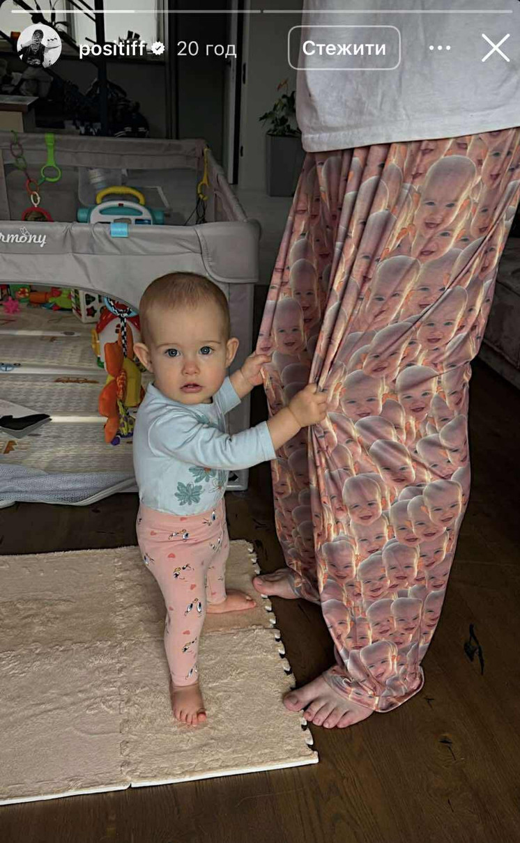 У своєму Instagaram Олексій показав. як його донечка у дитячому боді стоїть на ногах міцно тримаючись за його штани. До речі, штани у репера із портретом його донечки.