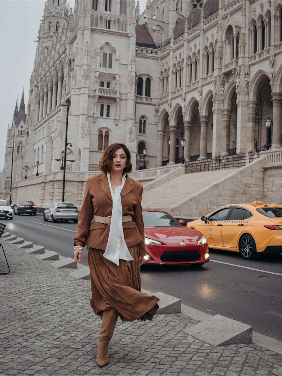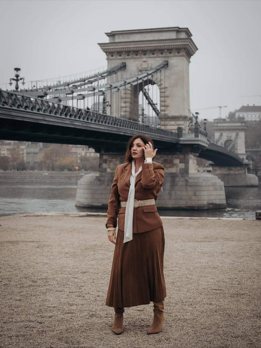 Вона опублікувала в Instagram серію фото, для яких попозувала в угорській столиці. 39-річна Оля була вбрана в елегантний осінній лук: костюм зі спідницею в теплому коричневому кольорі, чоботи на підборах, білий шалик і сіре пальто.
