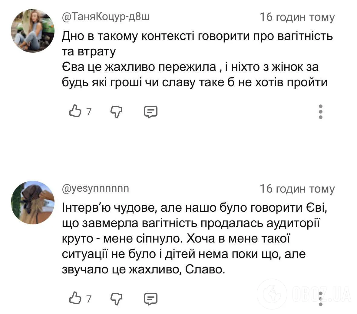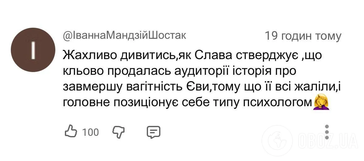 "У вас на каналі, перед тим як написати комент, з'являється вислів "будьте ввічливими", але, на думку всіх адекватних людей, вислів "погодься, ця історія кльово продалася аудиторіі" в контексті завмерлої вагітності – й**аний п*здець. Чому ви вирішили, ніби маєте хоч якесь мізерне право взагалі про це говорити, та ще й у такому тоні всезнайки?"