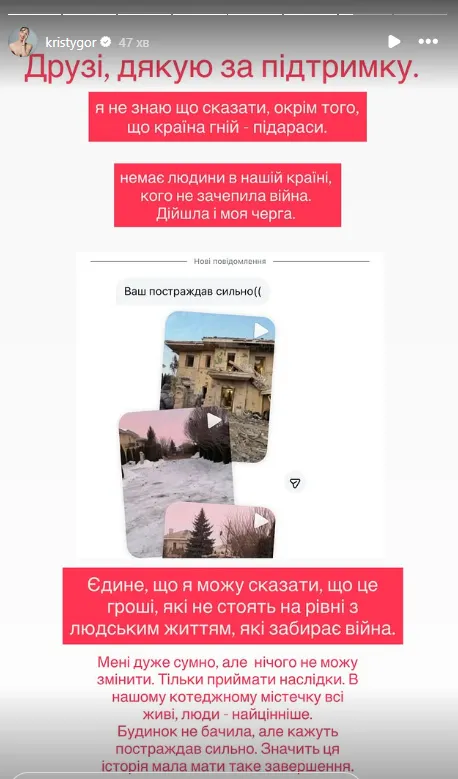 "Немає людини в нашій країні, кого не зачепила війна. Дійшла і моя черга. Єдине, що я можу сказати, що це гроші, які не стоять на рівні з людським життям, які забирає війна. Мені дуже сумно, але нічого не можу змінити. Тільки приймати наслідки. У нашому котеджному містечку всі живі, люди – найцінніше. Будинок не бачила, але кажуть постраждав сильно. Значить ця історія мала мати таке завершення", – написала Горняк.