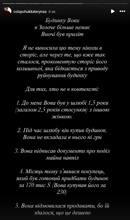 "Будинку Вови більше немає. Уночі був приліт, – повідомила Катерина. – Прокоментую сториз його колишньої, яка бідкається щодо руйнування будинку. Для тих, хто не в контексті: до мене Вова був у шлюбі 1,5 роки (загалом 2,5 років стосунків) з іншою жінкою; під час шлюбу він купив будинок. Вона не вкладала у нього ні гривні. Вова підписав документи про поділ майна навпіл. Місяць тому з'явився покупець, який був готовий придбати будинок за 170 тисяч доларів (Вова купував його за 230). Вона відмовилася продавати, бо їй здалося, що це дешево".
