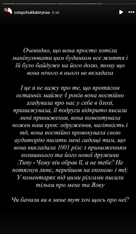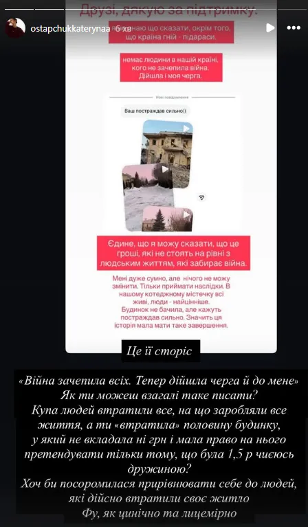 "Війна зачепила всіх. Тепер дійшла черга й до мене". Як ти можеш взагалі таке писати? Купа людей втратили все, на що заробляли все життя, а ти "втратила" половину будинку, у який не вкладала ні гривні, й мала право на нього претендувати тільки тому, що була 1,5 роки чиєюсь дружиною? Хоч би посоромилася прирівнювати себе до людей, які дійсно втратили своє житло", – обурилася Катерина Остапчук.