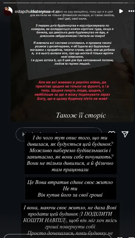 Катерина Остапчук також повідомила про втрату житла, проте закцентувала увагу саме на нібито "бідканні" Христини Горняк. Вона розкритикувала жінку і за її реакцію на втрату будинку і на "відсутність вкладу" в нерухомість.