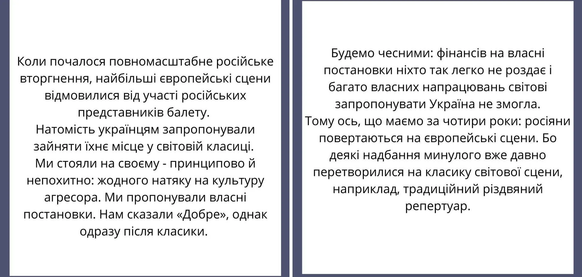 "Ми стояли на своєму – принципово й непохитно: жодного натяку на культуру агресора. Ми пропонували власні постановки. Нам сказали "Добре", однак одразу після класики. Будемо чесними: фінансів на власні постановки ніхто так легко не роздає, і багато власних напрацювань світові запропонувати Україна не змогла. Тому ось, що маємо за чотири роки: росіяни повертаються на європейські сцени. Бо деякі надбання минулого вже давно перетворилися на класику світової сцени, наприклад, традиційний різдвяний репертуар", – зазначив Кривоконь.