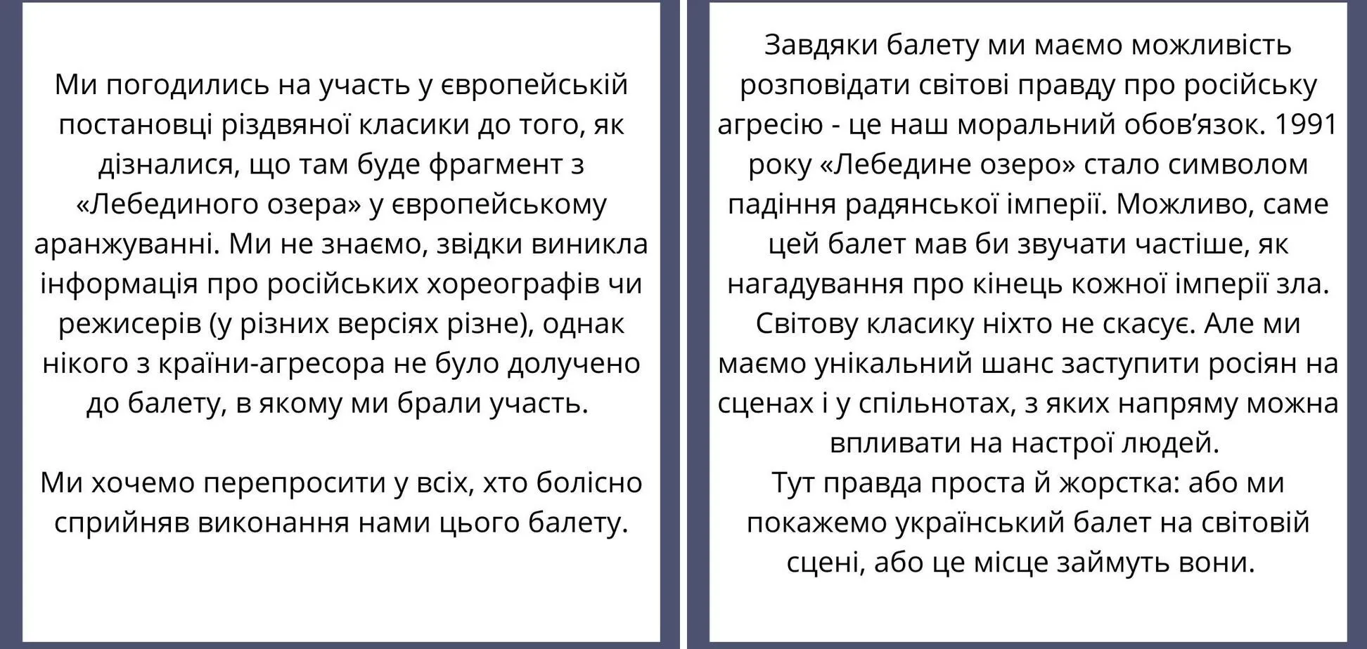 У своїй заяві в Instagram Кривоконь наголосив, що після початку повномасштабного вторгнення найбільші європейські сцени відмовилися від співпраці з російськими артистами балету та почали залучати українських виконавців. За його словами, українська сторона принципово наполягала на відсутності будь-яких представників країни-агресора й на просуванні власних постановок, однак зіштовхнулася з фінансовими та виробничими обмеженнями.