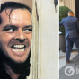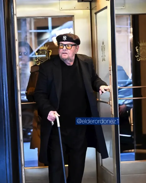У цей день Ніколсон був одягнений у темний одяг – чорне пальто, штани та светр. На голові – берет, а очі прикривають темні окуляри. Він виходить через скляні двері готелю, тримаючись однією рукою за ручку, а іншою спираючись на тростину.