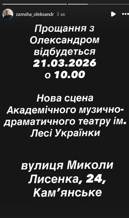 "Прощання з Олександром відбудеться 21.03.2026 ο 10.00. Нова сцена Академічного музично-драматичного театру ім. Лесі Українки вулиця Миколи Лисенка, 24, Кам'янське", – повідомили вони.