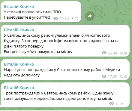"У Святошинському районі уламки впали біля житлового будинку. За попередньою інформацією, пошкоджені вікна на рівні пʼятого поверху. Екстрені служби прямують на місце", – уточнив Кличко.