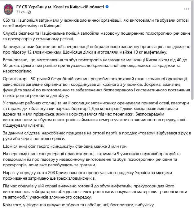 "Служба безпеки та Національна поліція запобігли масовому поширенню психотропних речовин та прекурсорів у столичному регіоні. За результатами багатоетапної спецоперації нейтралізовано злочинну організацію, повідомлено про підозру 12 зловмисникам. Щомісяця ділки виготовляли майже 10 кг амфетаміну", – йдеться в повідомленні.