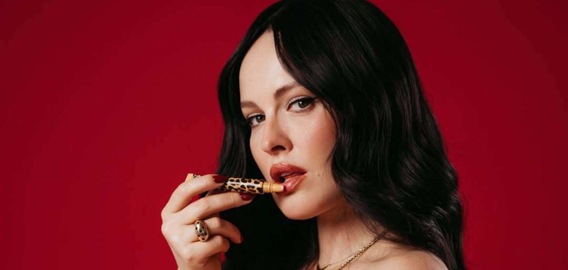 У зубах модель тримає помаду, що додає знімкам зухвалого настрою.