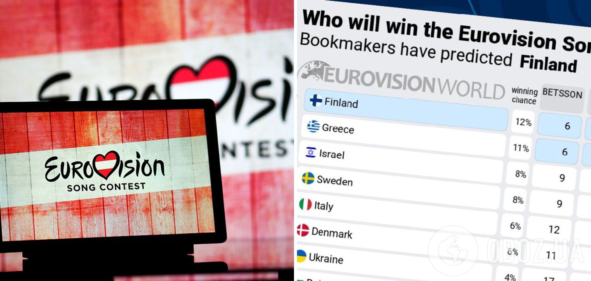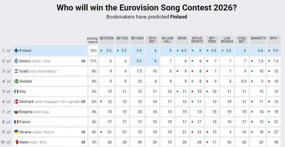 Попереду України у прогнозах нині перебувають Фінляндія (12%), Греція (11%), Ізраїль та Швеція (по 8%), Італія та Данія (по 6%), а також Болгарія та Франція (по 4%). Примітно, що частина країн, які наразі мають кращі шанси на перемогу, ще навіть не визначилися зі своїми представниками.