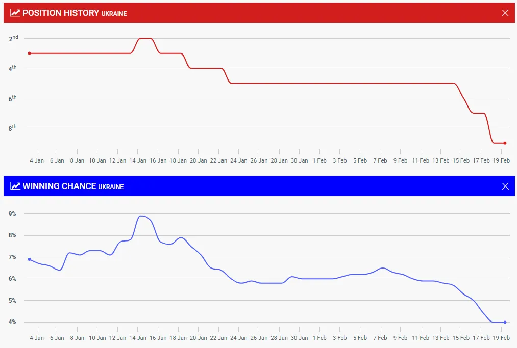 Ще в середині січня Україна перебувала значно вище у прогнозах, а відсоток перемоги сягав майже 9%. Однак за останній місяць показник стабільно знижувався. Якщо на початку лютого йшлося про приблизно 6% (на момент проведення Нацвідбору), то тепер букмекери оцінюють шанси лише у 4%.