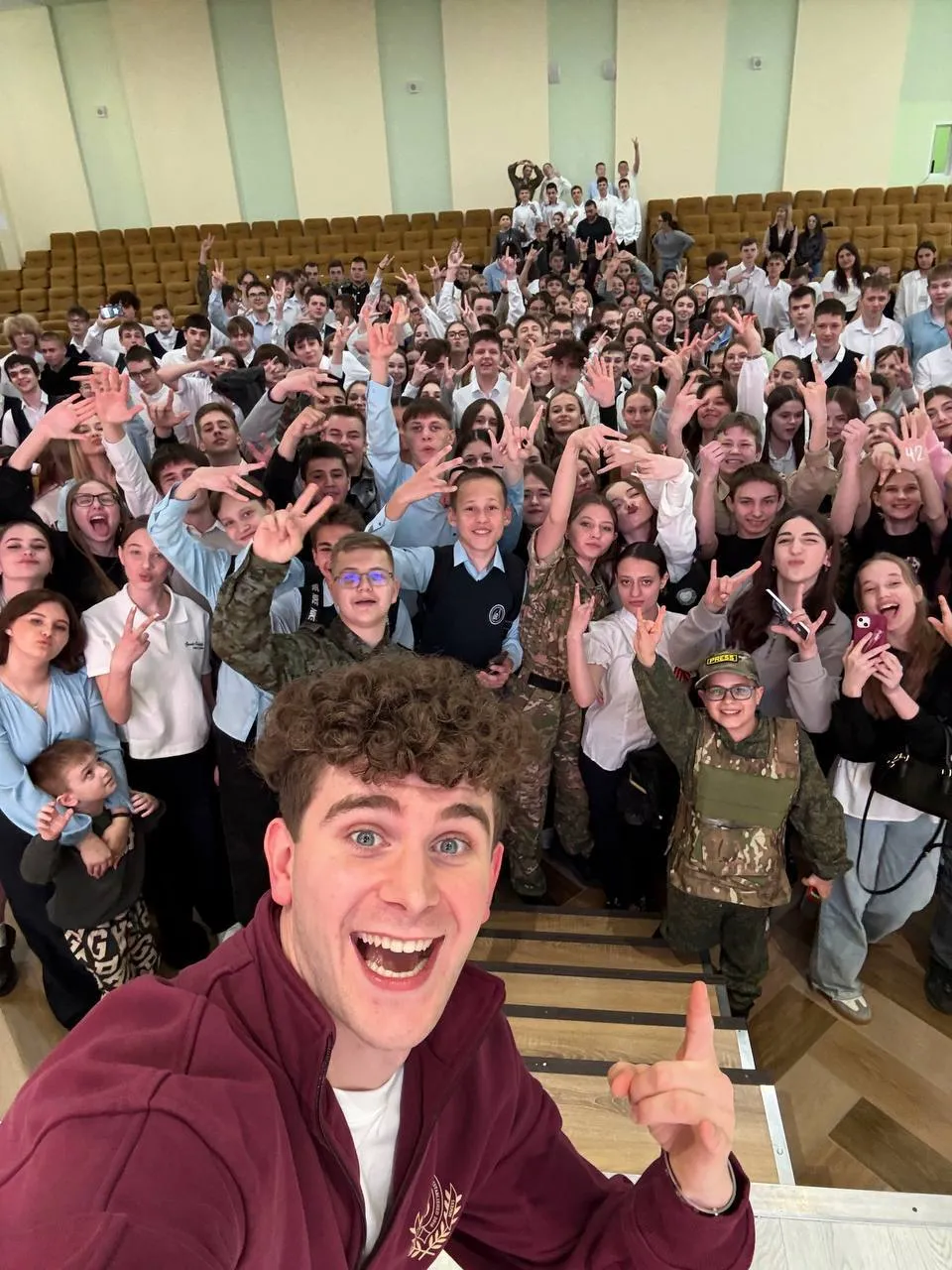 Блогер відвідав Курськ, де зустрівся з учнями-учасниками прокремлівської організації "Рух перших" (аналог радянської піонерії). На фото з зустрічі діти позували у військовій формі.