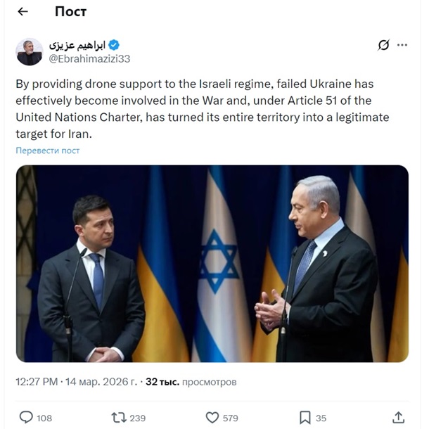 "Надавши підтримку ізраїльському режиму за допомогою безпілотників, зазнаюча краху Україна фактично виявилася залученою у війну і, згідно зі статтею 51 Статуту Організації Об'єднаних Націй, перетворила всю свою територію на законну цілю для Ірану", – написав він.