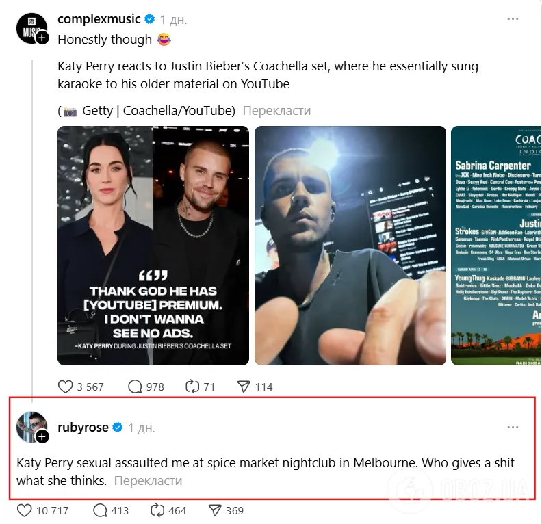 "Звинувачення, які Рубі Роуз поширює в соціальних мережах щодо Кеті Перрі, є не лише неправдивими, а й прикладом небезпечної та безвідповідальної брехні. Пані Роуз неодноразово висовувала серйозні публічні звинувачень у соціальних мережах проти різних осіб, які були спростовані самими фігурантами цих звинувачень", – наголосили представники зірки.
