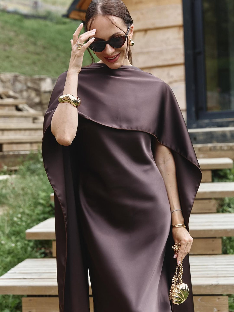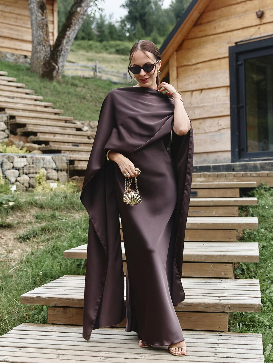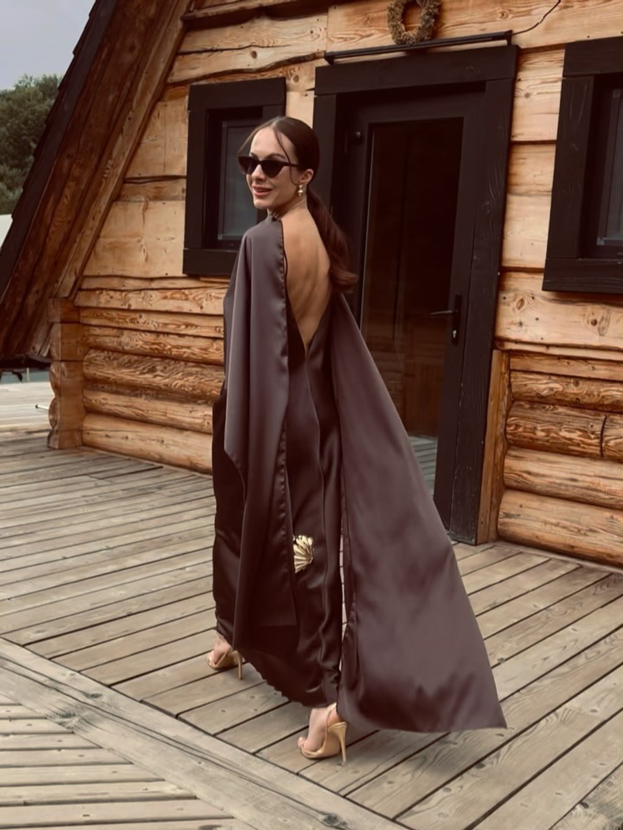Христина попозувала у мінімалістичній максі сукні шоколадного кольору з вирізом на спині та накидкою. Свій образ вона доповнила золотими прикрасами, маленькою сумочкою та сонцезахисними окулярами.