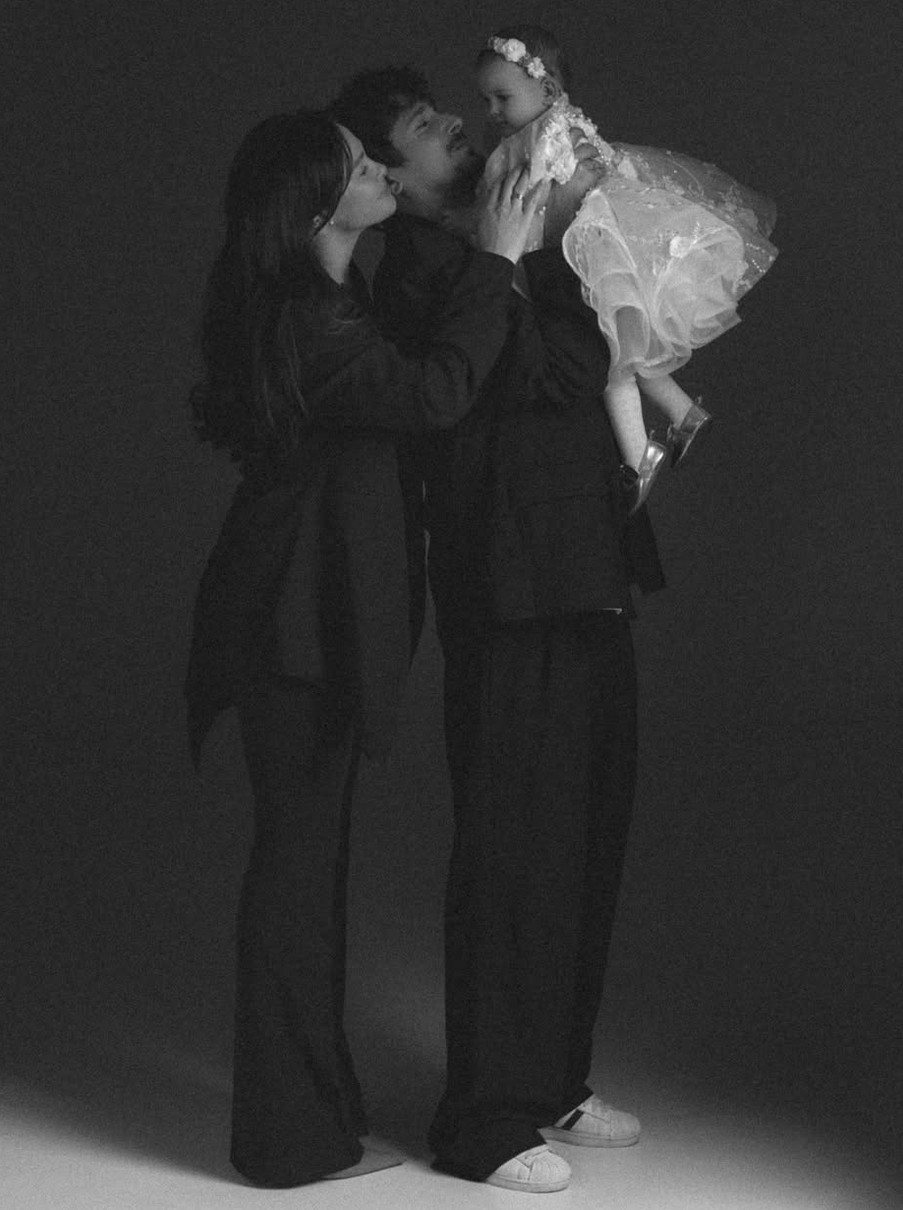 У своїх Instagram зіркові батьки зробили спільну публікацію, на якій попозували у стильних костюмах з іменинницею в ніжній рожевій сукенці з пишною спідницею і квітами.