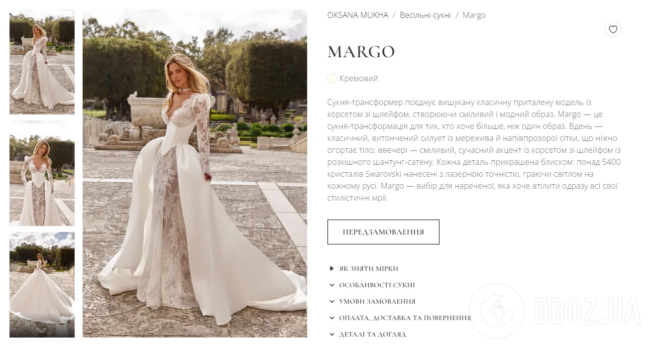 Наречена з'явилася у сукні моделі Margo від українського бренду OKSANA MUKHA. Це облягаюча мереживна сукня з довгими рукавами, оздоблена більш ніж 5400 кристалами Swarovski.