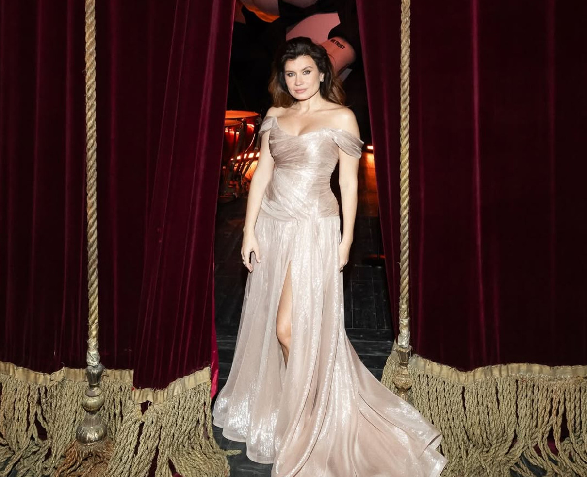 Ірина прийшла на концерт чоловіка у ніжно-рожевій корсетній сукні з вирізом