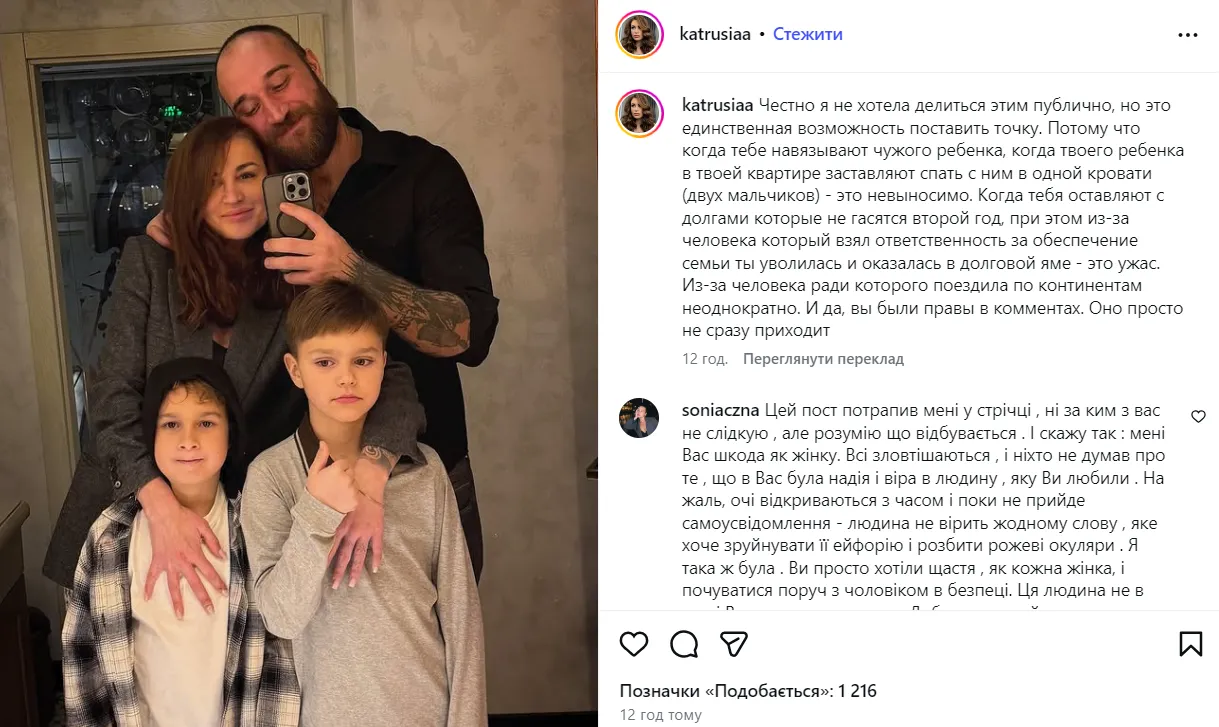 "Чесно кажучи, я не хотіла ділитися цим публічно, але це єдина можливість поставити крапку. Тому що коли тобі нав'язують чужу дитину, коли твою дитину в твоїй квартирі змушують спати з нею в одному ліжку (двох хлопчиків) – це нестерпно", – розповіла Катерина.