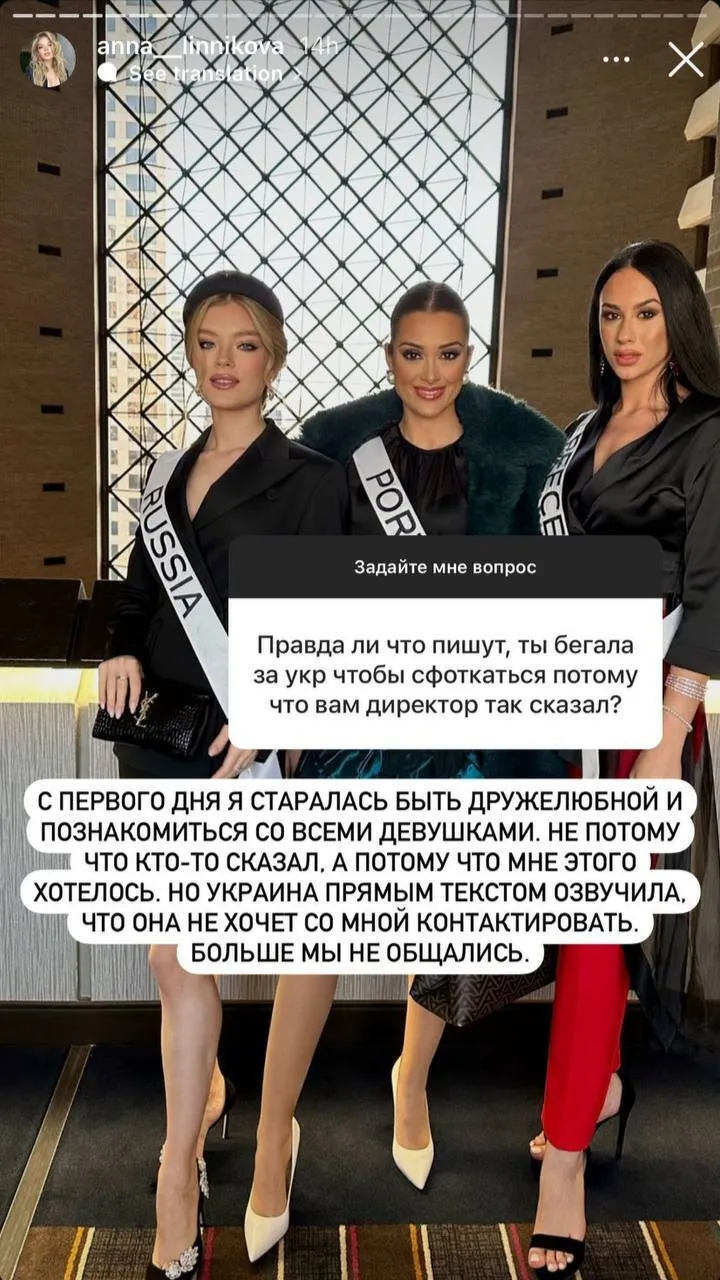 Однак прохання українців було проігнороване, тому Анна Ліннікова все ж взяла участь у конкурсі "Міс Всесвіт". Що цікаво, тоді росіянка дуже сумнівалася в своєму успіху на міжнародній арені, адже усвідомила, що світ аж ніяк не радий бачити там громадянку РФ. У своєму Instagram вона влаштувала опитування, де поцікавилася у підписників: чи вдасться їй потрапити в топ-16 учасниць. Допис вона доповнила фразою "у теперішній ситуації", уникаючи слова "війна".