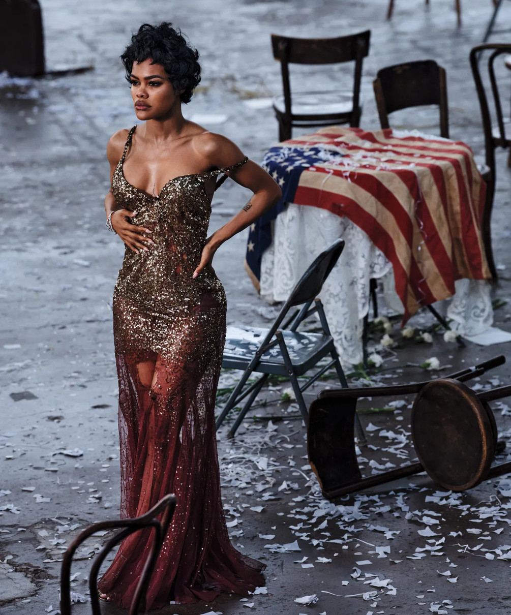 На сторінках журналу знаменитість постала на атмосферних фото з символікою США. Серед луків Теяни була прозора сукня з блискітками, білі шортики у поєднанні з чоботами і шапкою пілота та максі з короною, яка нагадувала Статую Свободи.
