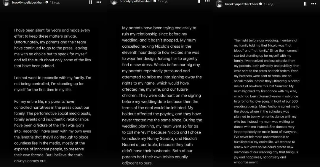 "Я мовчав роками й робив усе можливе, щоб ці питання залишалися приватними. На жаль, мої батьки та їхня команда продовжували звертатися до преси, не залишивши мені іншого вибору, як виступити від свого імені і розповісти правду", – написав Пельц Бекхем.