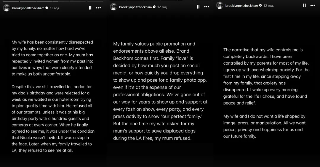 Старший син Девіда та Вікторії Бекхемів Бруклін Пельц Бекхем публічно заявив про розрив стосунків із батьками та відмову від примирення. Він звинуватив їх у багаторічному контролі, маніпуляціях і спробах зруйнувати його шлюб з акторкою Ніколою Пельц.