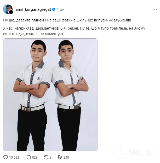 "Ну шо, нумо глянемо на ваші фотки зі шкільних випускних альбомів! У нас, наприклад, дермантинові білі ремені. Те, що я тупо тремпель (вішак. – Ред.), на якому висить одяг, взагалі не коментую", – зазначили брати. Серед інтернет-користувачів свої світлини показали також українські зірки.