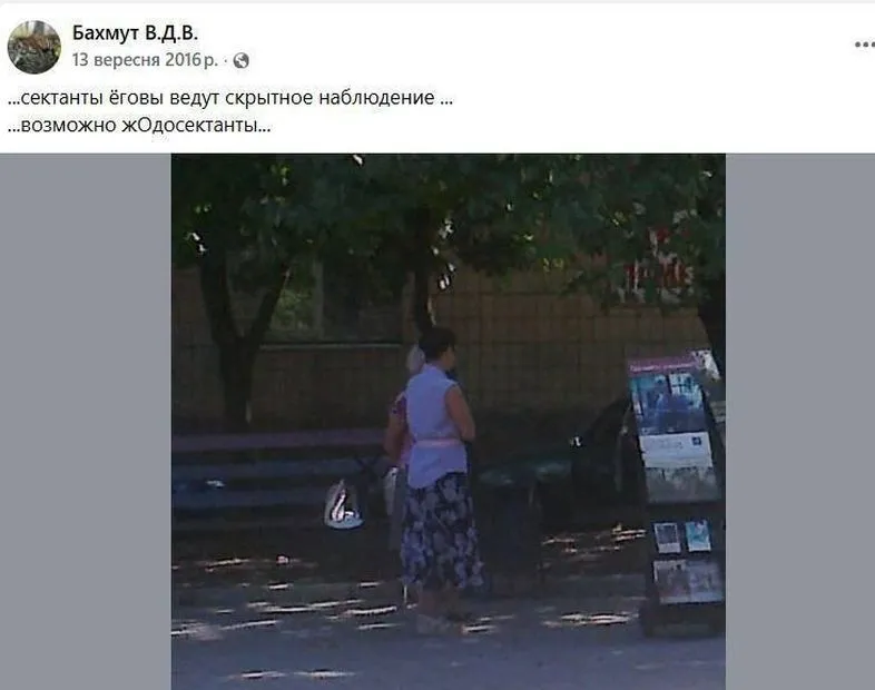 Як приклад фото та підпис розміщені на його сторінці у Фейсбук від 13 вересня 2016 року, де він пише: "…сектанты ёговы ведут скрытое наблюдение… возможно жОдосектанты…"